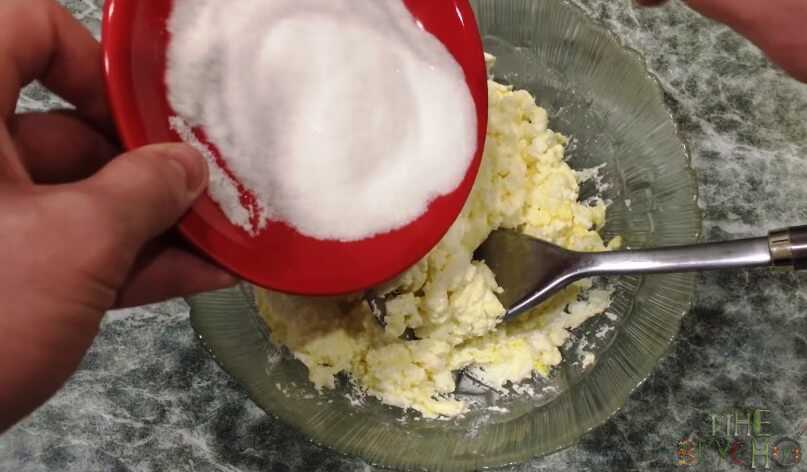 2. Добавляем пару ложек сахара. Его количество будет зависит от ваших вкусовых предпочтений или же если творог у вас кислый то сахара можно добавить побольше. Перемешивать лучше начать после следующего шага.