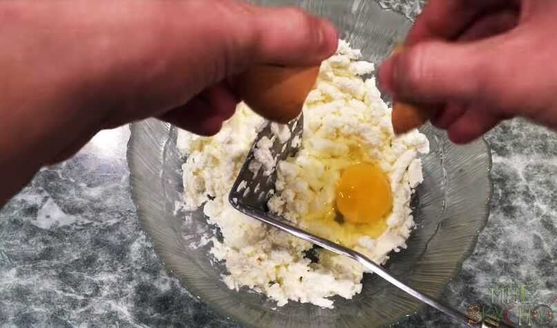 - Разотрите творог с яйцом вилкой или толкушкой.