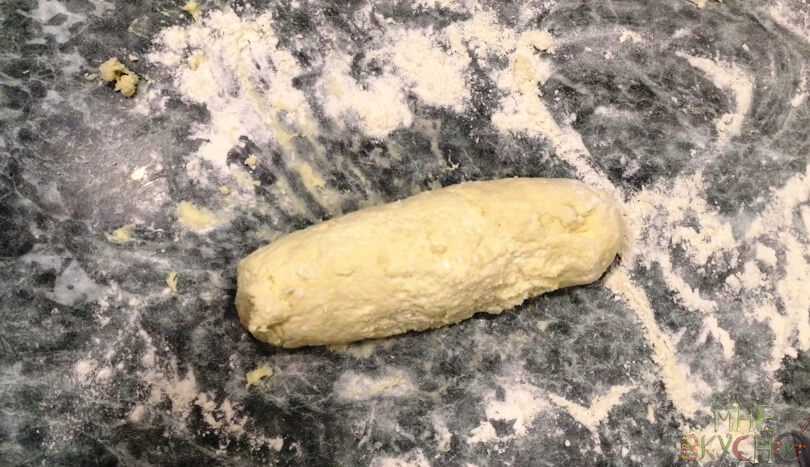 2. Присыпьте рабочую поверхность мукой и выложите туда готовое тесто. Немного помесите его, чтобы оно стало еще более однородным. Затем скатайте из него колбаску и нарежьте ножом на одинаковые шайбочки.