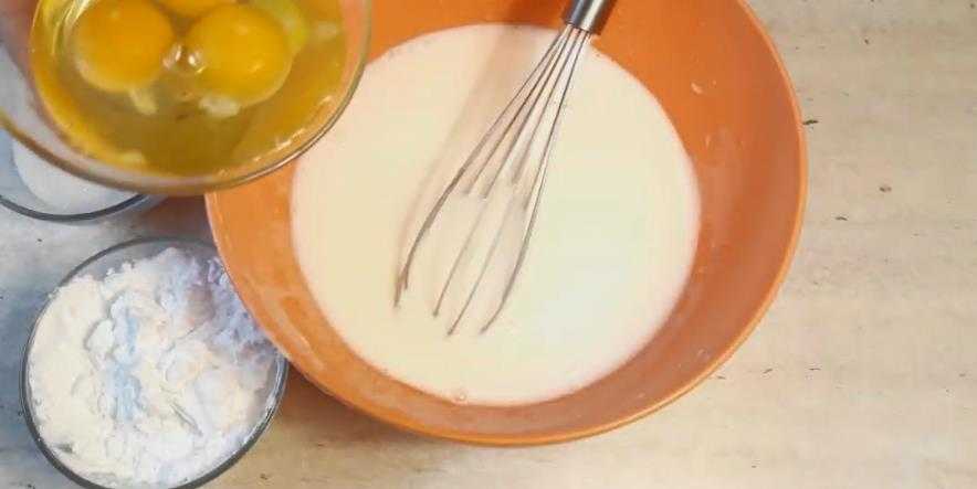 Яйца для теста берем крупные. Если они небольшого размера (вторая категория), то можно взять еще одно. Смешиваем с сахаром и солим. Удобно использовать венчик, хорошо взбалтываем, после чего заливаем обычное коровье молоко.