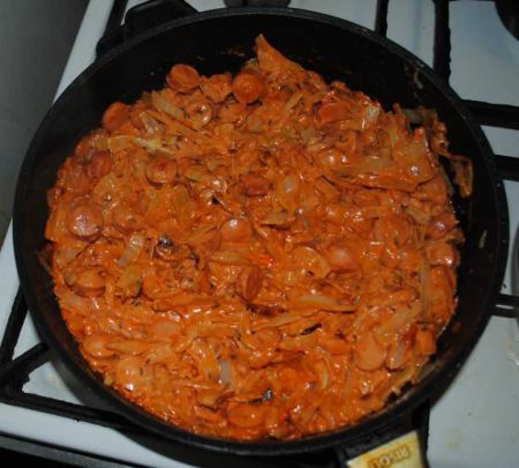 По мимо сосисок это блюдо можно сделать и с мясом, при чем неважно с каким. Я беру обычно свинину или курицу
