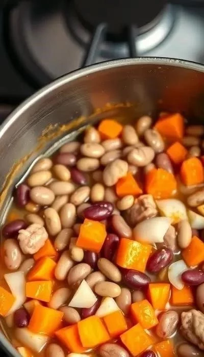 - Тушение: Довести до кипения, уменьшить огонь и тушить под крышкой 1,5-2 часа, пока фасоль и мясо не станут мягкими.