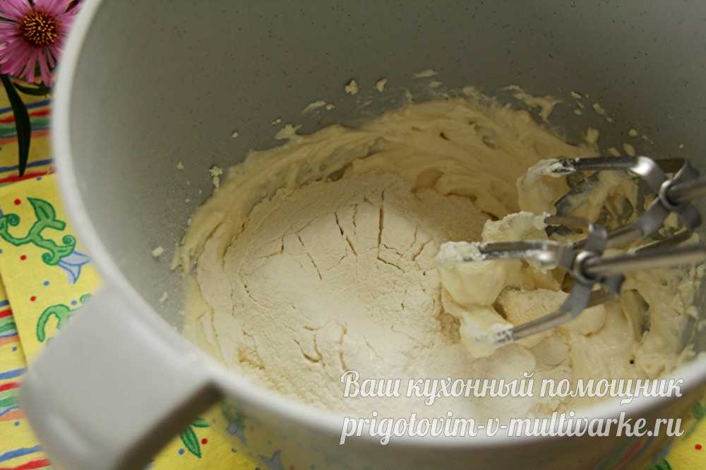 В отдельную глубокую емкость просеиваем муку, соединяем ее с разрыхлителем, перемешиваем. Теперь порциями всыпаем муку в творожную основу, продолжаем хорошо перемешивать.