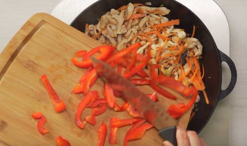 - Сладкий перец нарежьте продольными полосками, добавьте к остальным ингредиентам и обжаривайте 1 мин.