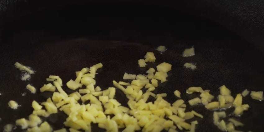 - Разогрейте хорошо сковороду, налейте растительное масло и обжарьте имбирь на среднем огне 1-2 минуты.