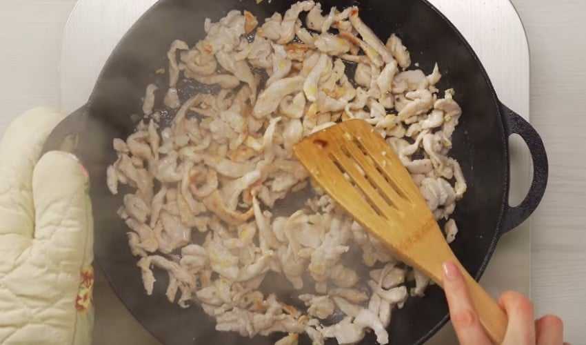 - Небольшими полосками нарежьте куриную грудку, присолите и поперчите.