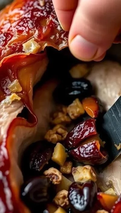 - Наполните брюшко утки черносливом, грецкими орехами и нарезанными яблоками.