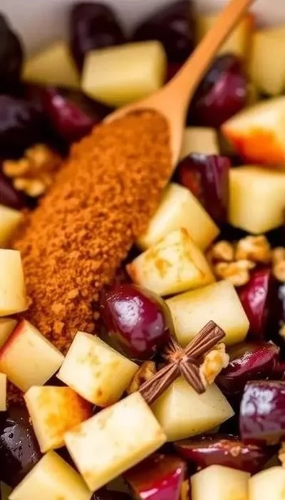 - Смешайте чернослив, яблоки, орехи, сухофрукты и корицу.