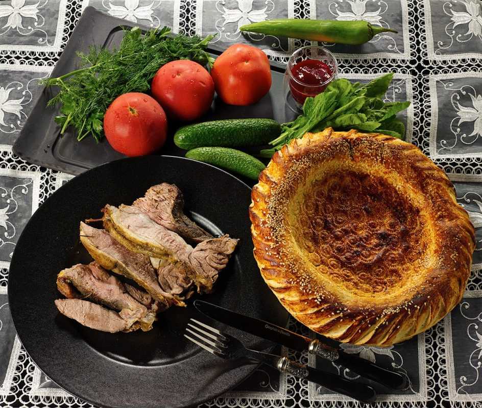 Узбекский хлеб, приподнесенный с овощами, острым соусом и мясом