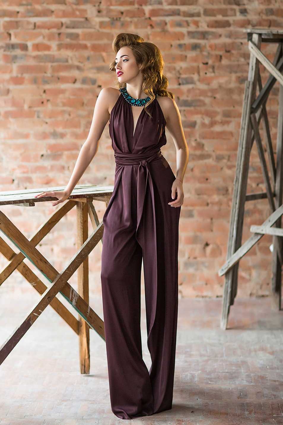Более элегантный и женственный вариант — однотонный, с широкими брюками, декорированный вставками из кружева. Выбирать лучше спокойные оттенки: оливковый, терракотовый. Можно выбрать и черный вариант, но он должен быть украшен блестящими элементами.