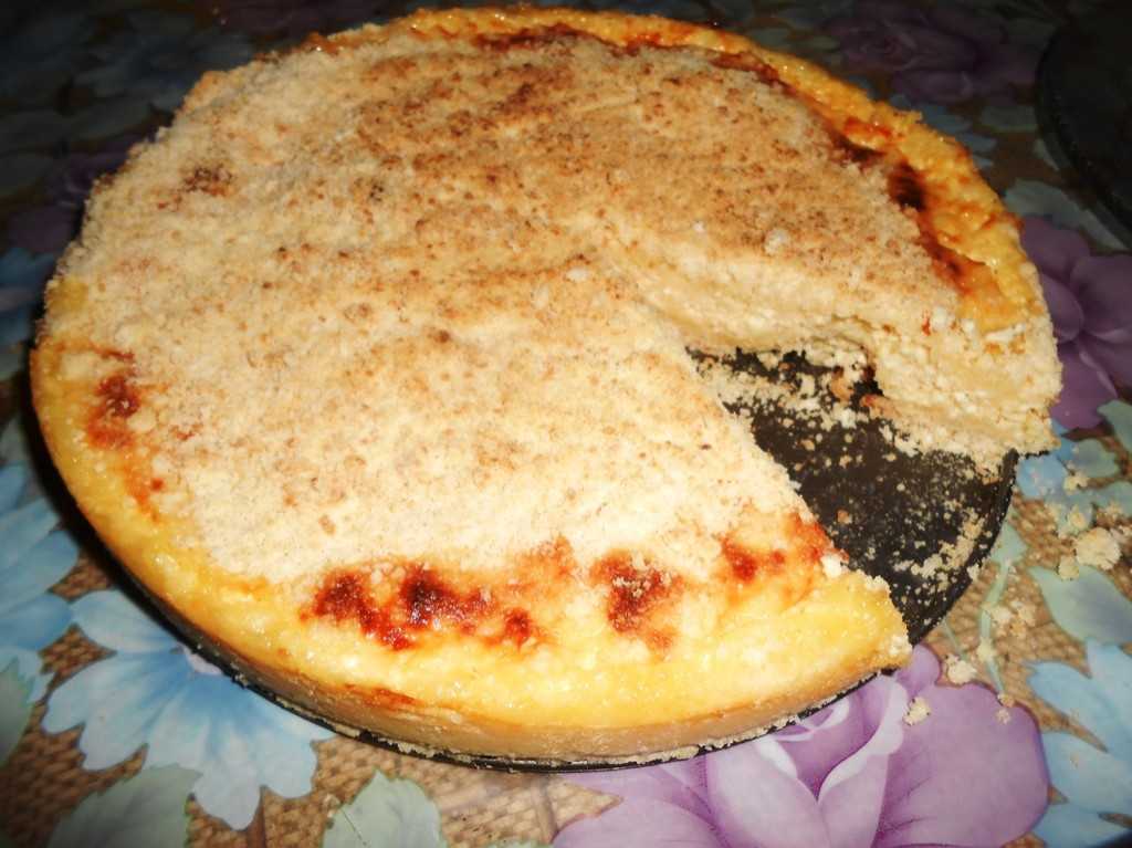 10.Сверху присыпьте оставшимся тестом, но уже не приминайте, а оставьте в таком рассыпчатом виде. Духовку разогрейте до 180º и поставьте пирог запекаться на 30 минут. Нужно, чтобы верх хорошо зарумянился.
