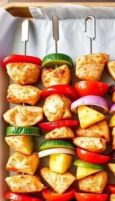 Приготовление: Замаринуйте курицу в кефирном маринаде на 4-8 часов. Нарежьте овощи крупными кусочками. Нанижите курицу и овощи на деревянные шпажки. Смажьте противень растительным маслом и выложите шашлычки. Запекайте в разогретой до 180°C духовке 25-30 минут, переворачивая в середине процесса.