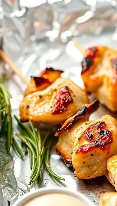 Приготовление: Замаринуйте курицу в майонезном маринаде на 2 часа. Нарежьте грибы пластинками. Нанижите курицу и грибы на шпажки. Запекайте в духовке при 180°C около 30-40 минут, периодически переворачивая.
