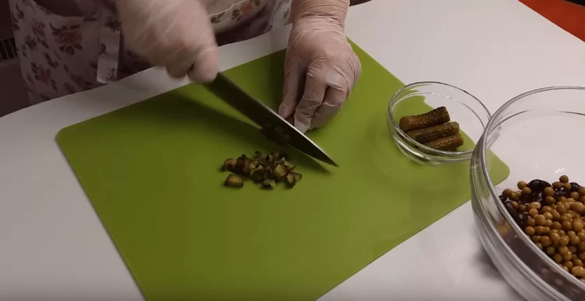 1. Фасоль и горошек перекладываем в глубокую миску, предварительно слив жидкость из банок. Корнишоны нарезаем кубиками и отправляем туда же.