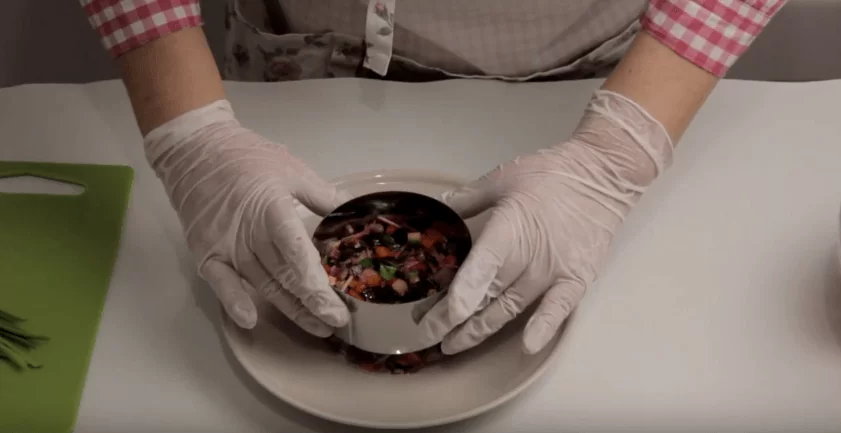 Существуют квадратные и круглые формы. И в одной, и в другой, винегрет выглядит эффектно и изысканно. Чтобы содержимое не рассыпалось после снятия металлических колец, его следует хорошенько уплотнить. И только после этого убирать форму. В качестве украшения использовать веточку зелени или кусочек огурчика.