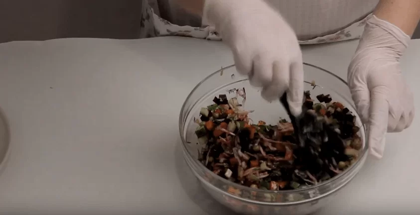 Свежая капуста также добавляется к этому салату в некоторых случаях, а морская придает ей больше полезности.