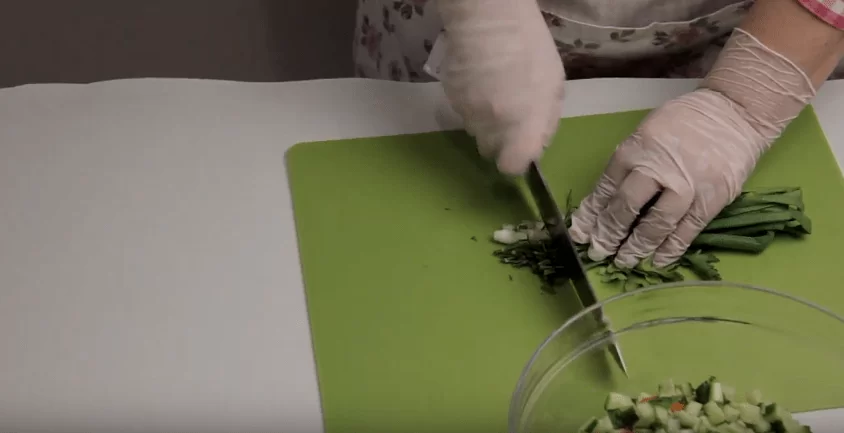 4. Лук лучше измельчить помельче. Если получится сделать кубики менее 0,5 см, будет идеально. Так он менее заметен в готовом блюде и отдает больше пряной влаги в капустный сок.