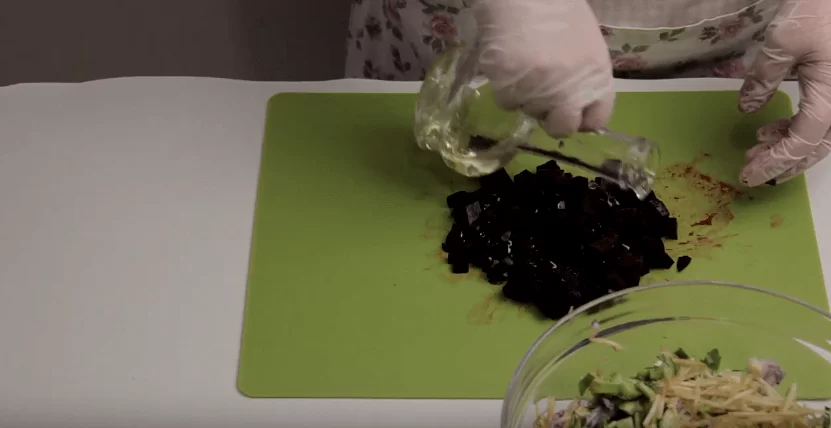А вот, свеклу после нарезки, заливаем маслом. Эта процедура сохраняет все овощи от окрашивания. Перемешиваем содержимое миски. Заправляем маслом и подаем на стол нежный салат.