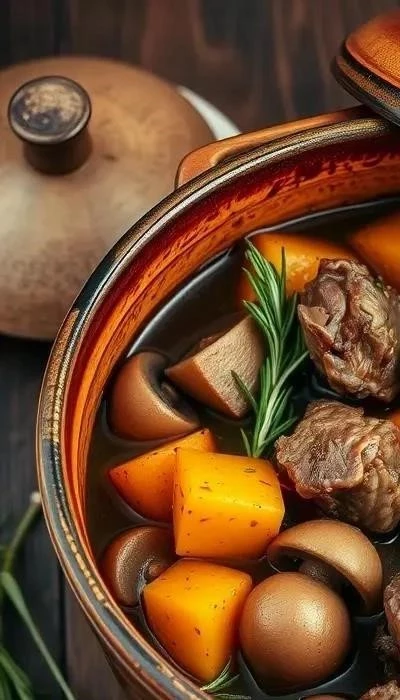 - Тушение в горшочках: Разложить баранину с овощами по горшочкам, добавить картофель, грибы, лавровый лист, перец горошком, соль и травы.