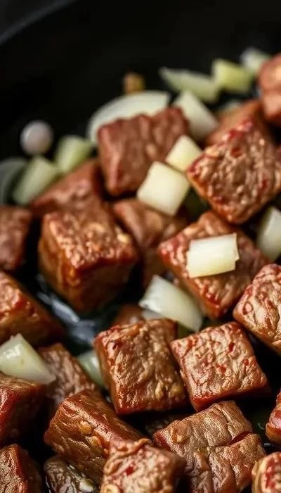 - Обжарка мяса: В глубокой сковороде разогрейте растительное масло. Обжарьте мясо на сильном огне до золотистой корочки со всех сторон. Это займет примерно 5-7 минут. Обжарка мяса помогает запечатать соки внутри и придает ему более насыщенный вкус.