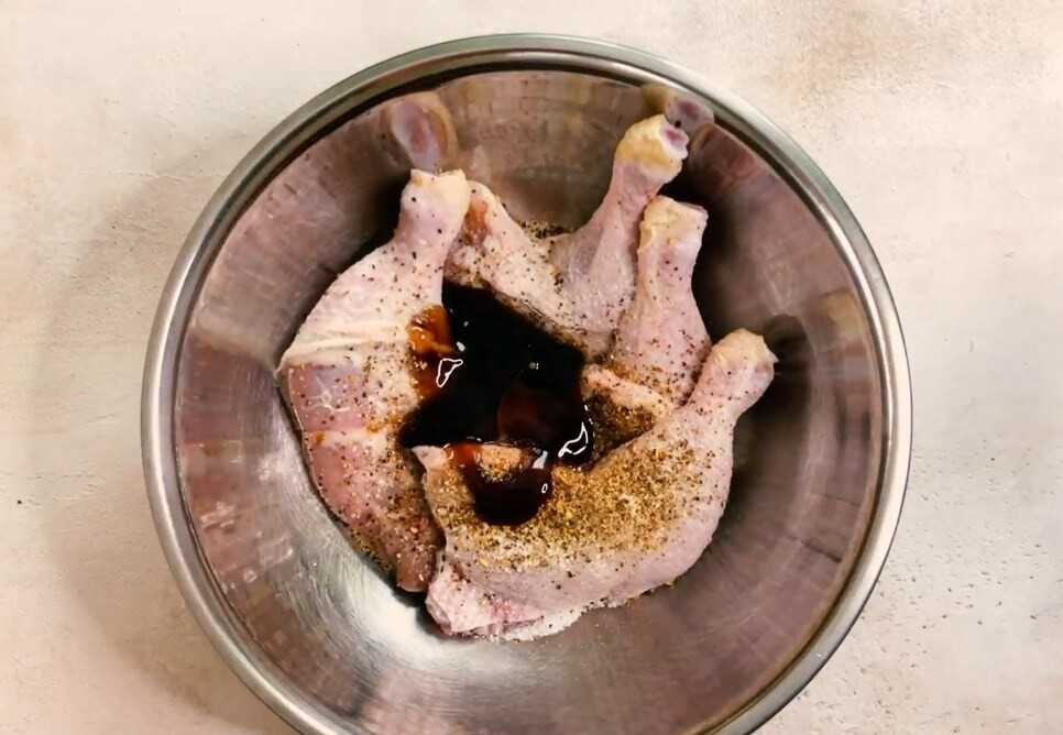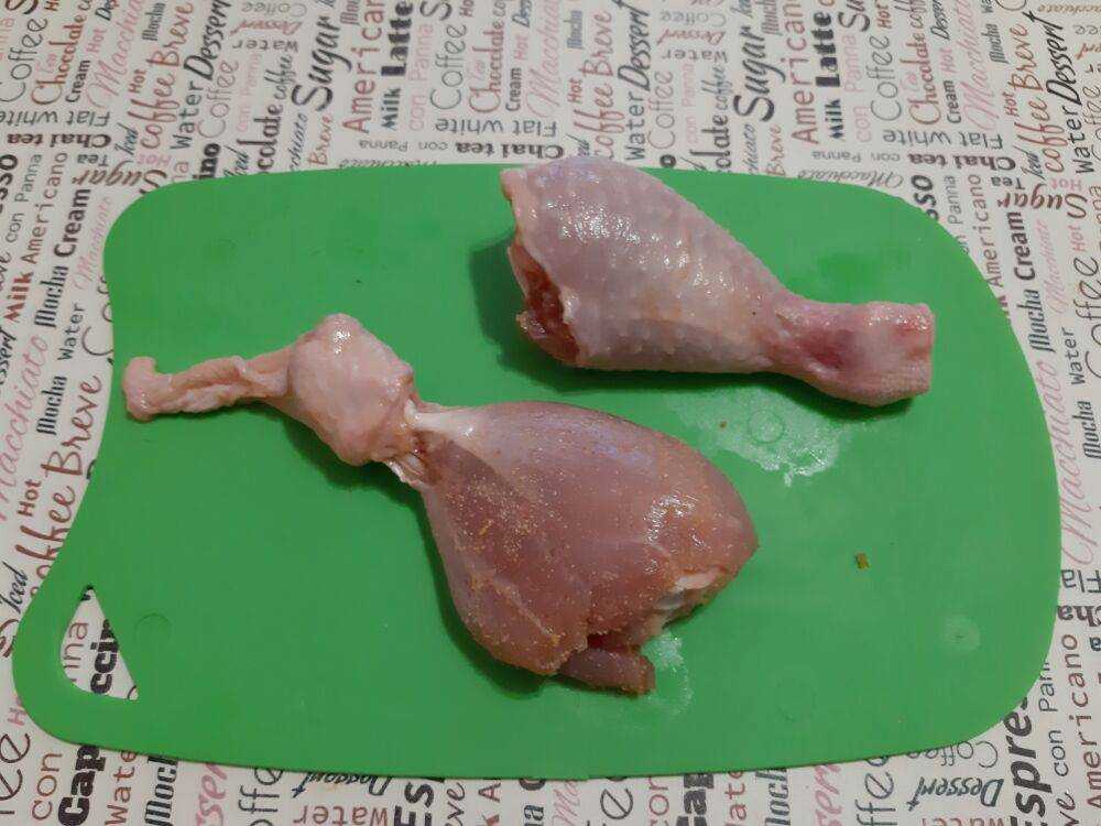 - Начнем приготовление сытного блюда с того, что промоем окорочка и дадим стечь остаткам воды с них. Теперь можно посолить курицу, сдобрить перцем и специями.