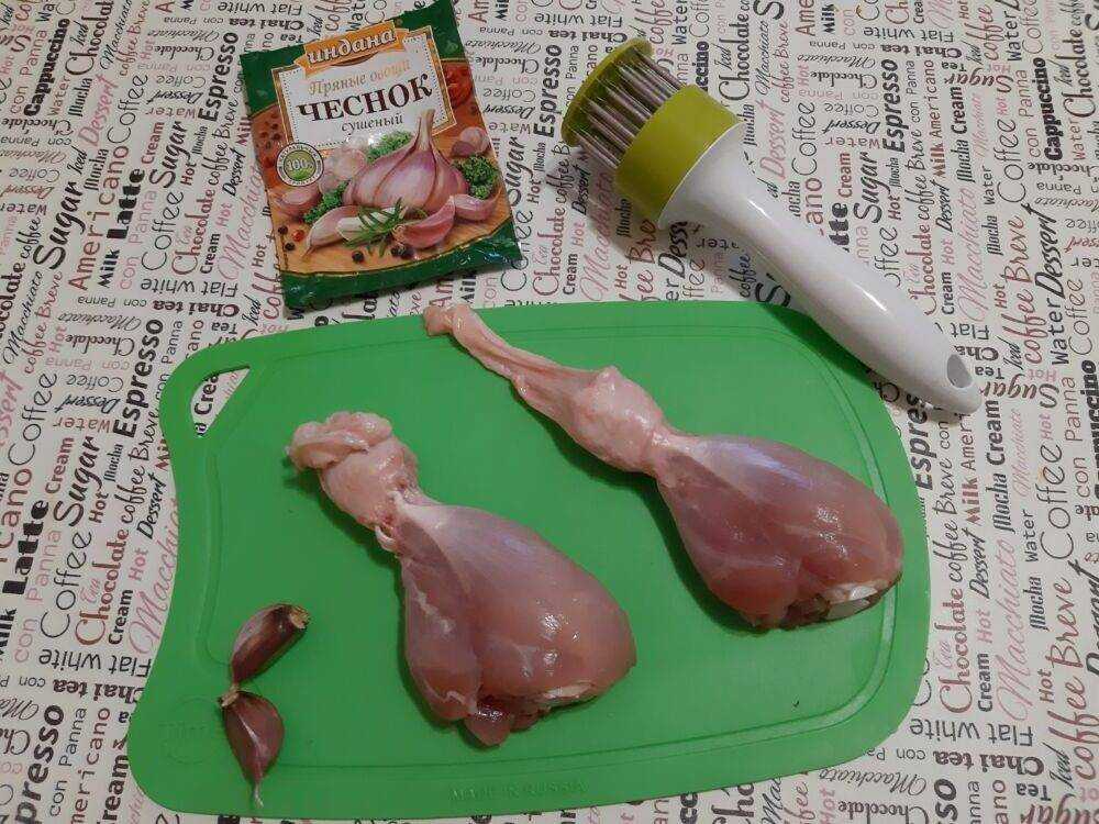 Куриные ножки, запеченные по этому рецепту подойдут к любому гарниру. Готовятся просто. В приготовлении есть оригинальная фишка! Интересно узнать, как сделать так, чтобы чеснок не пригорал во время запекания? Тогда читайте ниже.