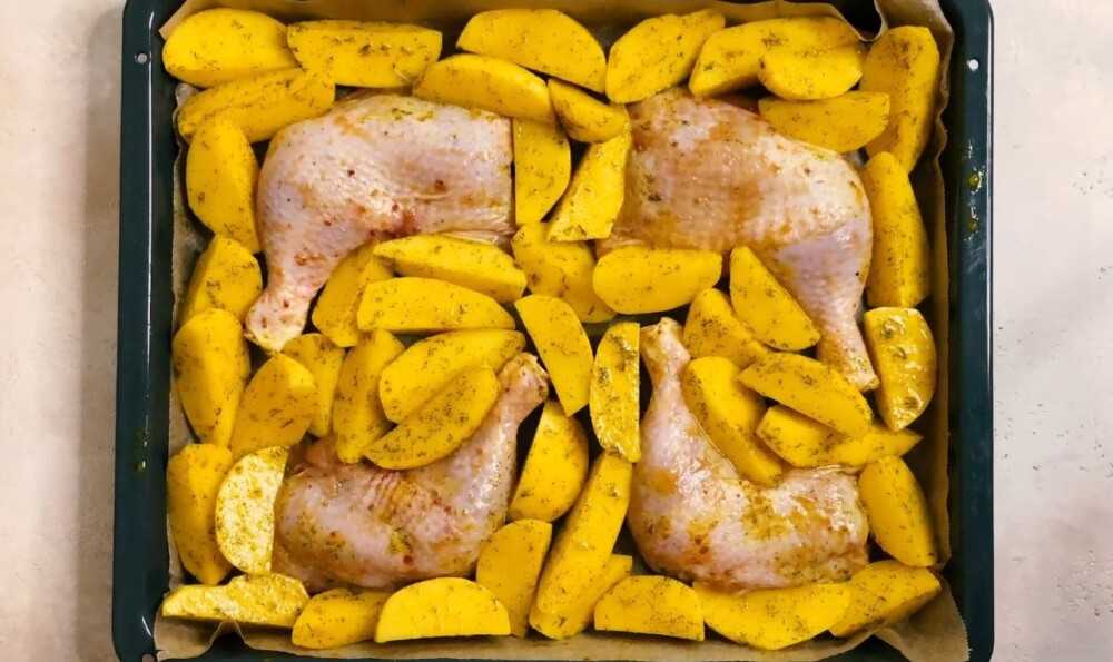 Простой рецепт сочных куриных окорочков с картошкой на противне