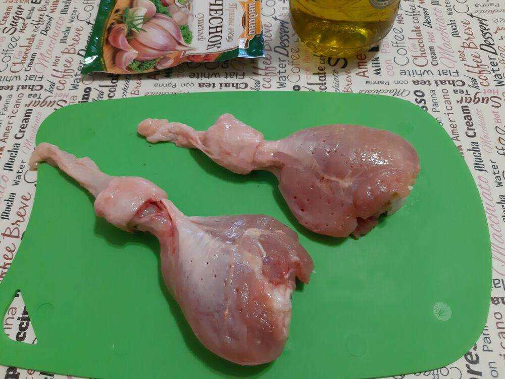 1. Окорочка должны быть либо свежими, либо полностью размороженными. Разрезаем каждый по суставчику на отдельные части — бедро и голень. Промываем прохладный водой и сушим салфетками от лишней влаги. Складываем их в миску с бортиками.