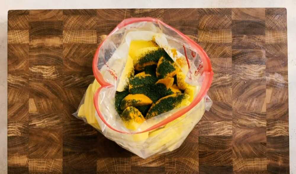 2. Картошку чистим, нарезаем дольками и перекладываем в пакет. Туда же добавляем соль, приправы и наливаем пару ложек растительного масла. Пакет закрываем и тщательно встряхиваем и перемешиваем содержимое.