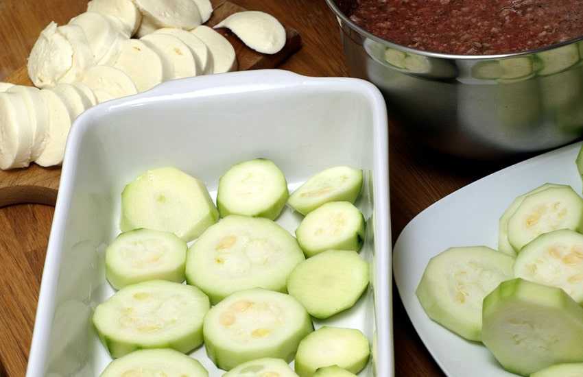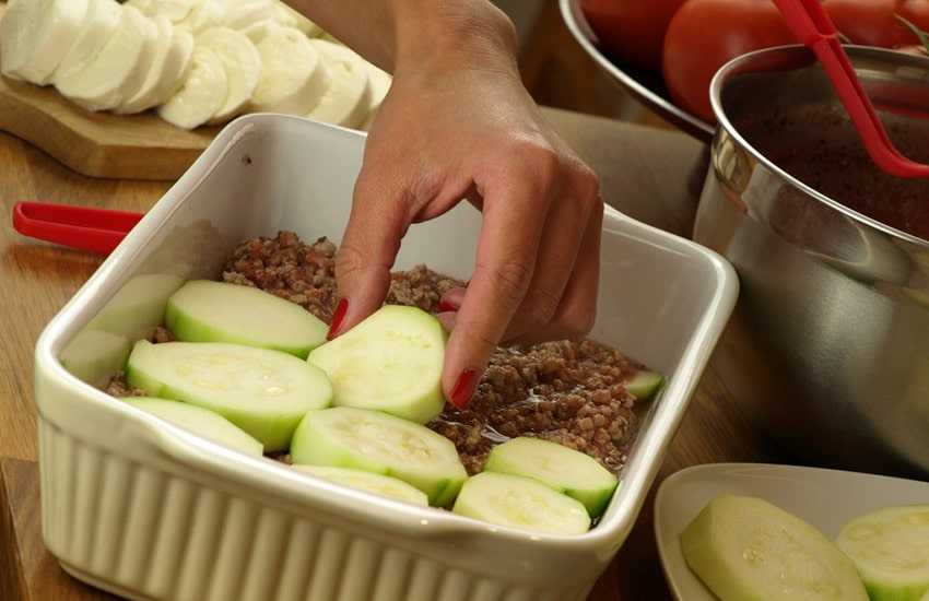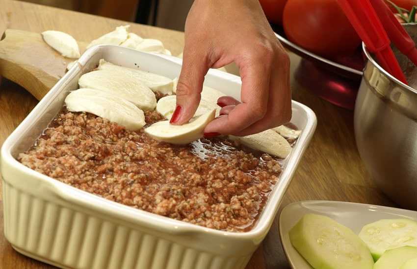 Оставшиеся кабачки также нарезаем тонкими кружками, выкладываем на мясную начинку. По желанию в верхнем слое можно чередовать овощ с ломтиками помидора, иногда используют баклажаны, но их лучше предварительно обжарить.