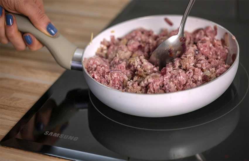 Поджарить на сковороде сначала лук пару минут, затем добавить к нему фарш и протушить под крышкой несколько минут.