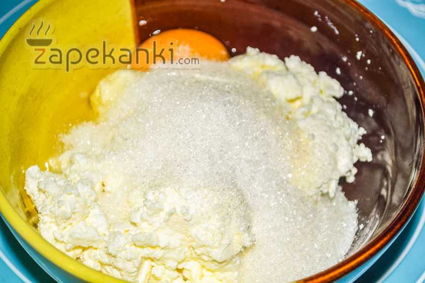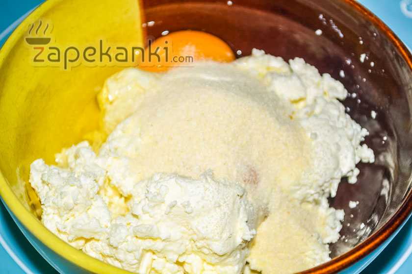 Выкладываем творог в миску, в которой будем замешивать тесто для запеканки. Обычно в пакете с творогом остается немного сыворотки, ее можно не выливать, а добавить в миску вместе с творогом (но не более 3 ст.л.). Если использовать сухой творог, то и запеканка получится суховатой, поскольку готовится без сметаны.
