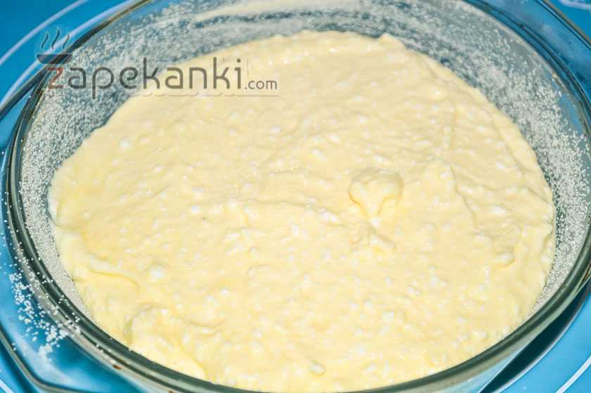 6. Перекладываем готовое тесто для запеканки в форму. Отправляем в духовку и ожидаем, когда творожная запеканка испечется. Это приблизительно 40 минут.