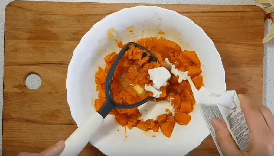 - Сначала приготовим пюре из тыквы. Для этого очищаем ее от шкурки, нарезаем на куски и отправляем в кипящую воду на 20 минут, так, чтобы она стала мягкой. После этого превращаем ее в пюре.