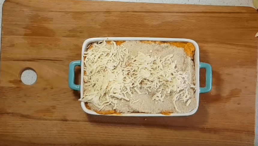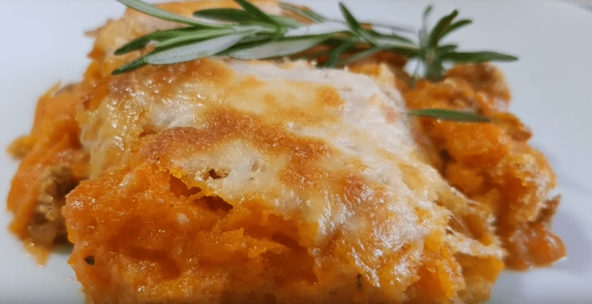 - После того как все готово, берем форму для выпечки и включаем духовку на 200 градусов. Первым слоем выкладывается курица, а затем тыквенная смесь. По желанию можно еще сверху насыпать сыра. Держать в духовом шкафу около 20 минут.