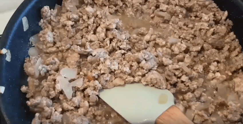- На горячей сковороде с небольшим количеством масла сначала обжариваем кольца лука, затем к нему добавляем предварительно нарезанную на небольшие квадратики курицу. Лучше всего прикрыть крышку, снизить огонь и тушить около 15 минут.