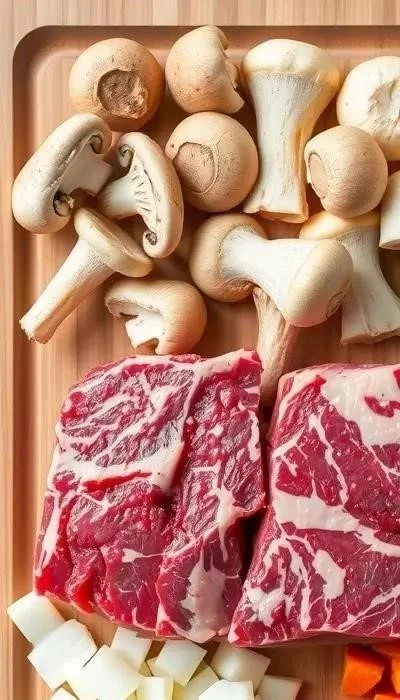 - Подготовка ингредиентов: Нарежьте мясо кубиками, лук полукольцами, морковь кружочками или соломкой, грибы пластинками.