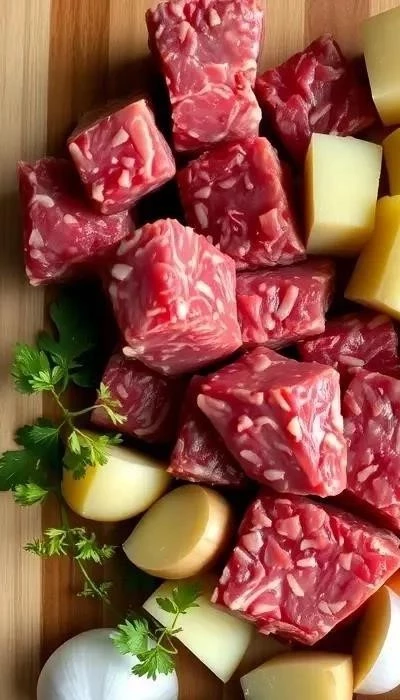 - Картофель: Очистите и нарежьте крупными кубиками, примерно такими же, как и мясо.