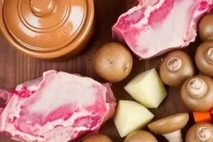 - Подготовка ингредиентов: Говядину промыть, обсушить бумажными полотенцами и нарезать кубиками среднего размера (примерно 3-4 см). Картофель очистить и нарезать крупными кубиками. Грибы промыть и нарезать пластинками. Лук очистить и нарезать полукольцами. Морковь очистить и нарезать кружочками или полукружочками. Чеснок очистить и мелко порубить.