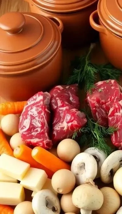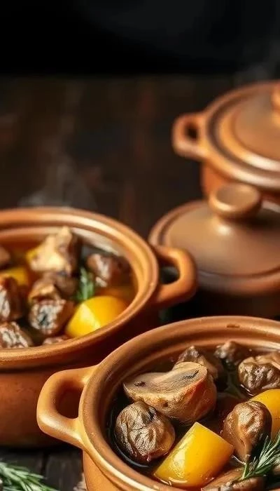 - Тушение в горшочках: В горшочки выложить слоями: картофель, обжаренные овощи, обжаренное мясо, грибы. Добавить томатную пасту, специи, лавровый лист. Залить бульоном (или водой) так, чтобы жидкость покрывала мясо и овощи примерно на 2/3. Добавить по кусочку сливочного масла в каждый горшочек.