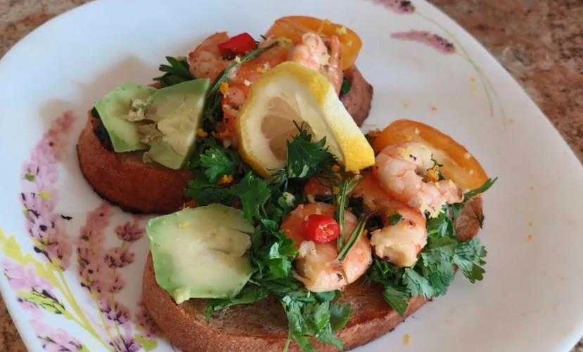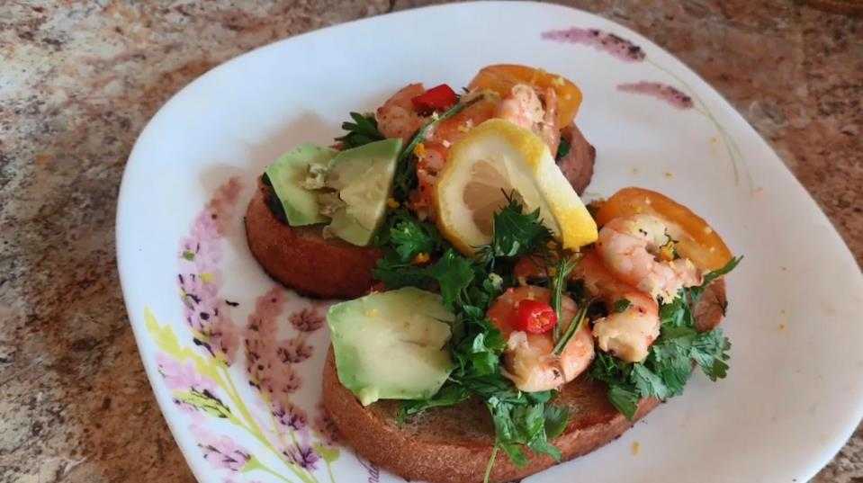 Жарить маринованные креветки на оливковом масле около 2-3 минут. На каждый ломтик хлеба положить зеленую подушку, кусочек авокадо, обжаренные морепродукты и декорировать долькой помидора.