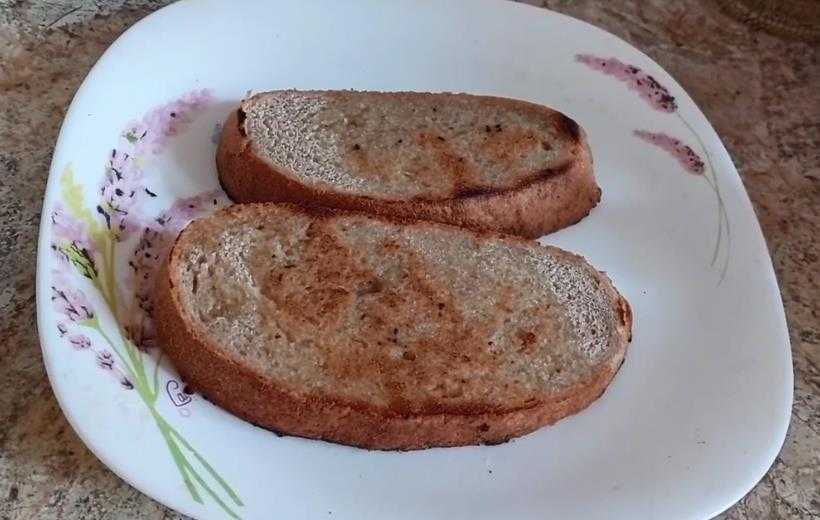 - Готовим хлеб: нарезаем на ломтики одинаковой толщины ( 1,5 см) и выкладываем в разогретую на гриле духовку или подсушиваем в тостере.