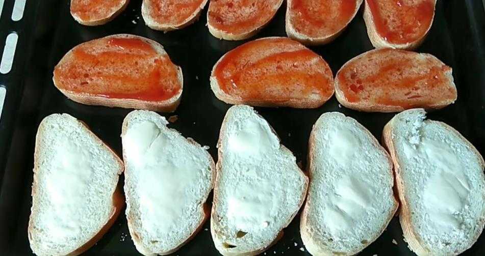 Окунаем хлеб в пропитку из кетчупа и сразу же перекладываем на противень (противень смазан маслом).