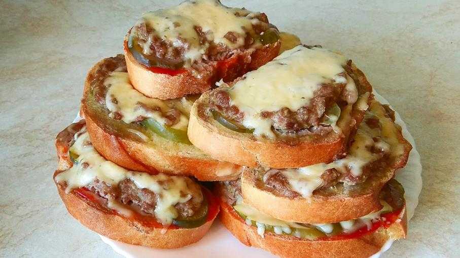 Горячая закуска с фаршем и сыром представляет собой сытный, сочный и аппетитный перекус, который легко способен заменить собой полноценный обед. Секрет блюда в том, что сырная корочка плотно закупоривает мясные поры, делая фарш удивительно сочным. Если заранее пропитать ломтики хлеба молоком, то бутерброды окажутся максимально нежными.