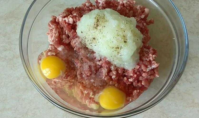 Лук пюрировать при помощи блендера, смешать с фаршем. Вбить в полученную массу яйца, посыпать перцем и солью.