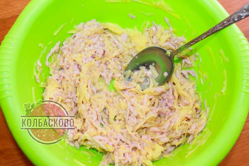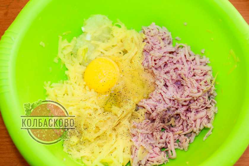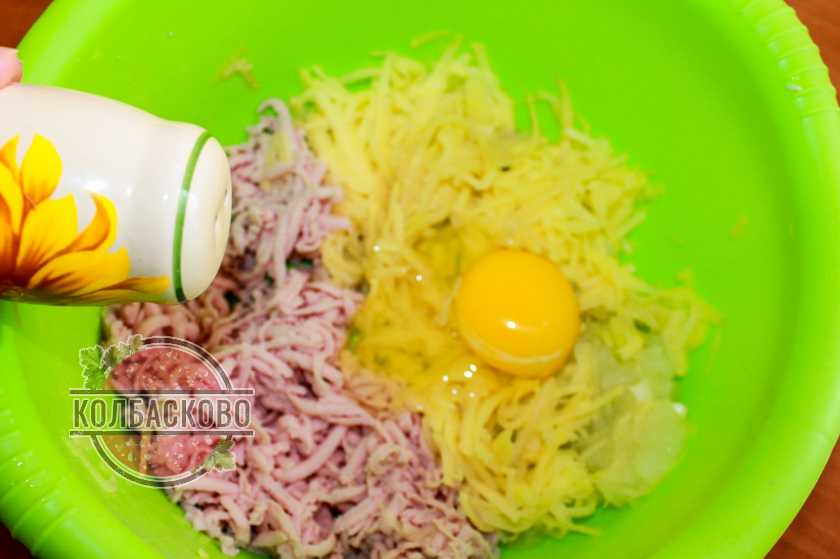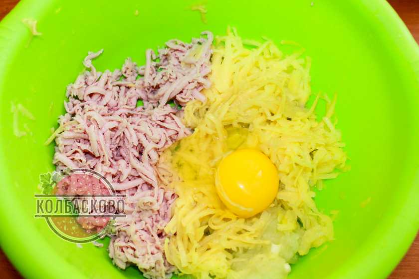 Вымытый очищенный картофель натрите на крупной тёрке. В отдельной миске взбейте венчиком яйцо. Влейте его к картофелю и тщательно перемешайте, посолив по вкусу.Натрите картофель и смешайте его с яйцом