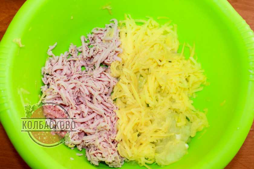 3. Перекладываем натертые овощи в удобную емкость, сюда же добавляем тертую колбасу, сардельку или сосиску. Подойдут любые вареные колбасные изделия – они очень мягкие, легко натираются на терке и хорошо держат с картофелем форму, не сползая с горячих бутербродов.
