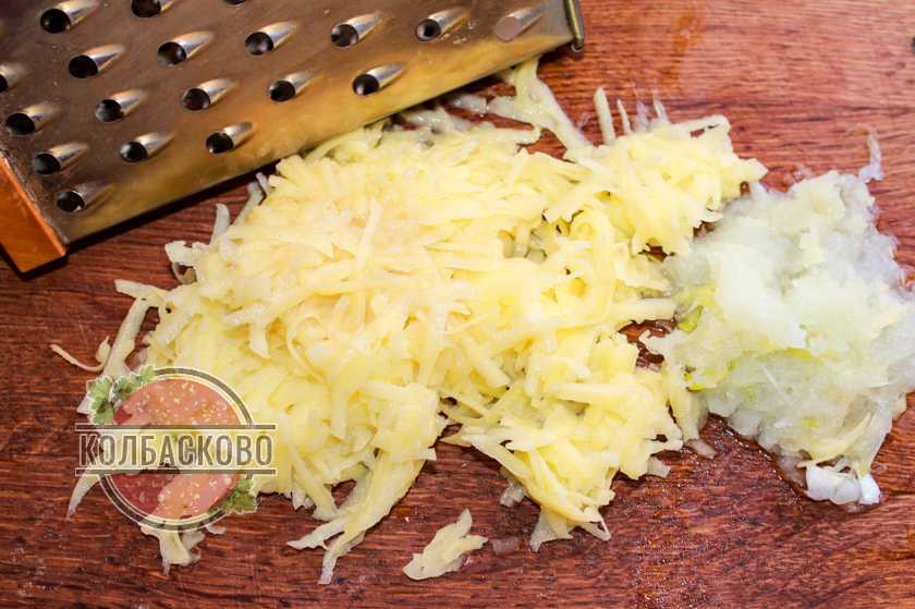 2. На крупной терке натираем картошку и лук. Последний выпускает много сока, от которого могут сильно слезиться глаза. Небольшой совет: на время работы с луком наберите полный рот холодной воды, этот способ немного облегчает действие лукового аромата.