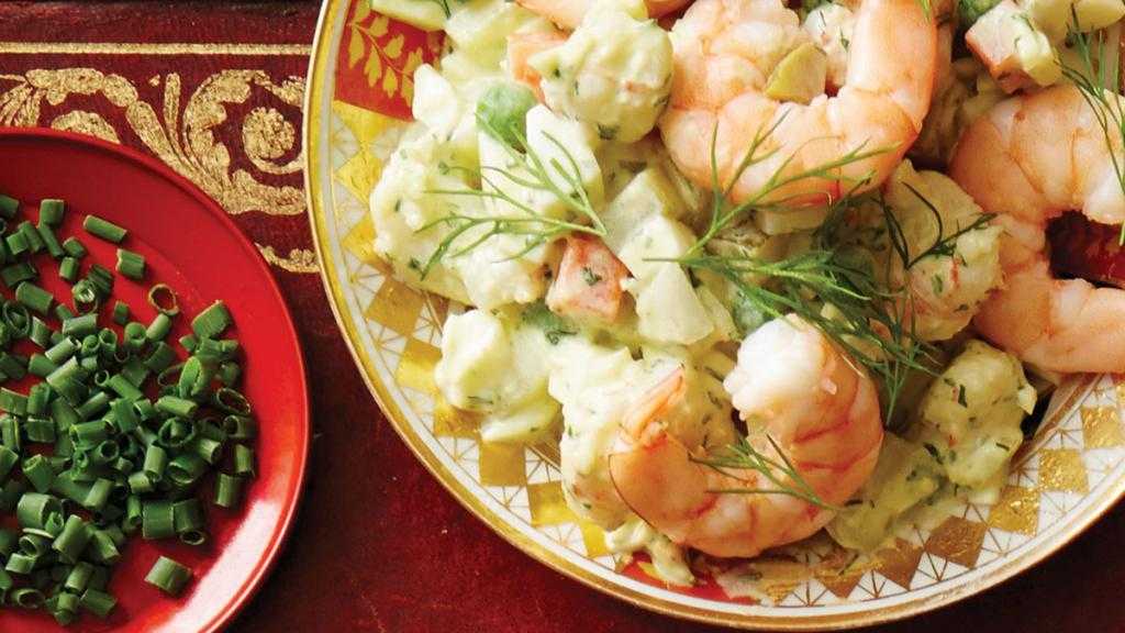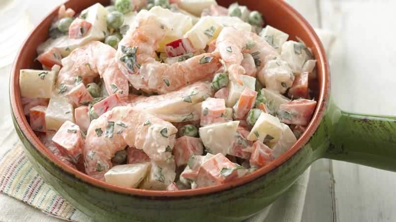 Очень вкусный Оливье с копченой курицей, креветками и свежими огурцами