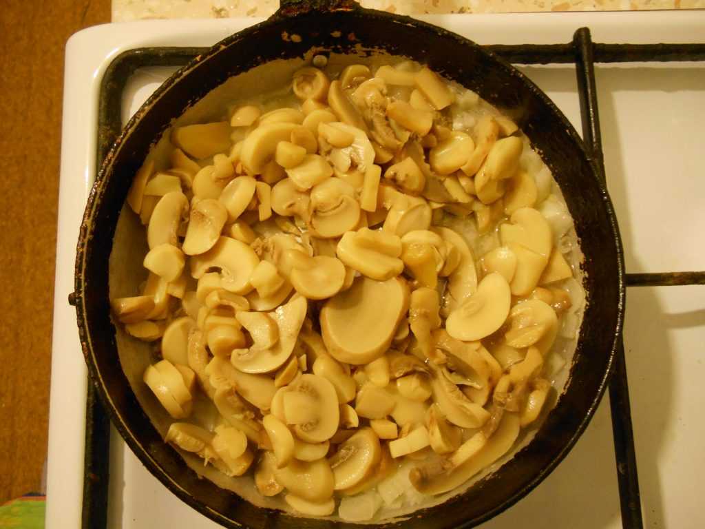 Шампиньоны нужно промыть, порезать кусочками и обжарить на сковороде вместе с мелко порезанным луком. Растительного масла добавлять много не нужно, хватит 1 ложки.